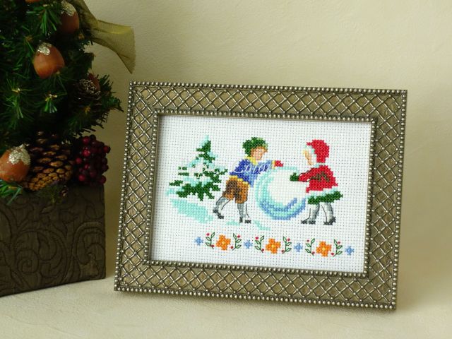 雪だるまを作っている様子が可愛いこちらのステッチは、クロスステッチで大人気のヴェロニクさんの図案です。