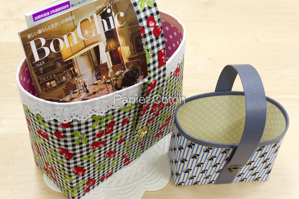 小さなサイズも作ってみました。こちらはマンガや小説が入るくらいのサイズです。持ち手と縁取りにはスキバルを使用しました。