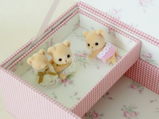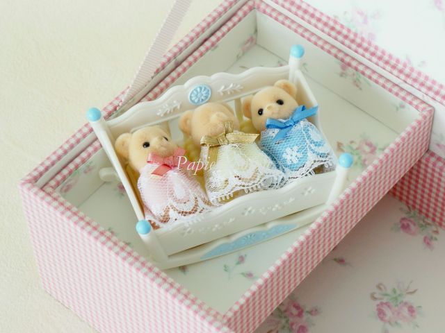 可愛い~!ビスケットクマのみつごちゃんです。真ん中の子はおねんね中♡